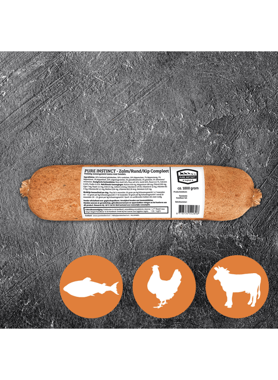20% bevleesd zalmkarkas, 30% rundvlees, 20% kippenvlees, 7% kippenmaag, 5% kippenlever, 5% kippenhart, 10% seizoensgroenten, 1% zalmolie, 1% vitaminen/mineralen.